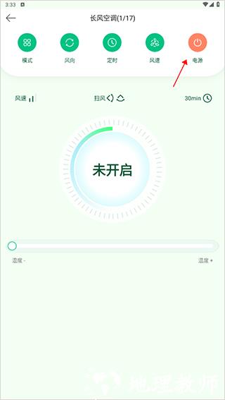 2、点击选中的空调设备,进入控制界面后,点击右上角电源按钮,通过开启手机红外线连接智能空调。
