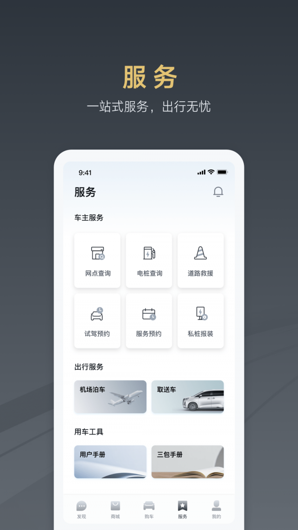 腾势汽车app为用户提供了功能丰富的车主服务,包含网点查询、电桩查询、道路救援、试驾预约、服务预约、私桩报装等服务,还有机场泊车、取送车等出行服务。