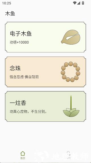 1、打开app后,可以看到电子木鱼、念珠和一柱香三种功能