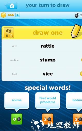 玩家能选择 Facebook 或 Email 登入,如使用 Facebook 的玩家能方便邀请身边的朋友一起玩此游戏。此外,此游戏在答对中赚得的金币,能购买道具或颜色之用,让大家在更易表达画中东西。免费版一开始提供了5个炸弹,能够在猜估中物时,能减少提供的字母,来增加猜对的机会。