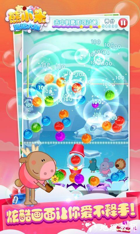 2. 操作简单易上手:游戏采用全屏触控的操作模式,玩家只需通过手指按住屏幕左右滑动来控制炮管的瞄准位置,放手即可射出泡泡。操作简单易懂,让玩家可以快速上手。