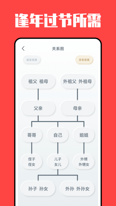 这亲戚关系啊,剪不断,理不清,别提多愁人了。亲戚计算机app将亲戚称呼整理成了图表,所有的关系一目了然,拒绝叫不出口。软件还有关系常识测试,父亲的母亲的哥哥叫什么?表伯父、堂伯父还是舅公?
