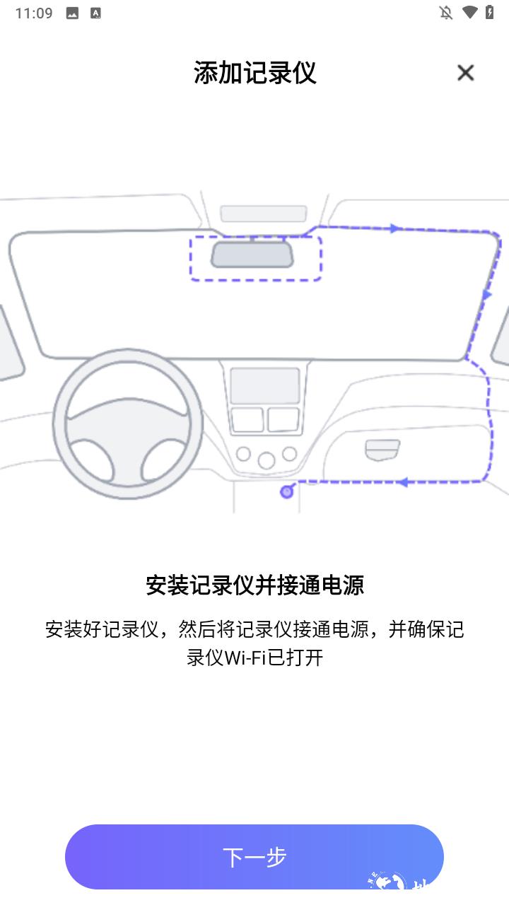 2、将记录仪安装好并接通电源,跟随引导进行下一步。