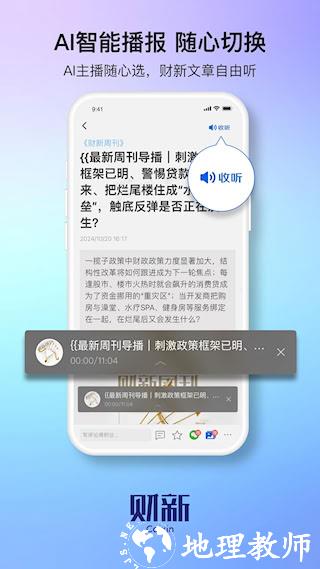 3、音频频道财新FM制作每日资讯简报与专题节目,支持定时关闭与播放速度调节。重要文章同步生成语音版本。
