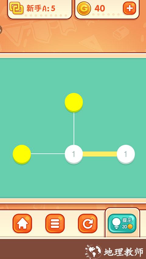 5、数字连线模式中,将端点两两相连,每连一条线段,两端点数字就减一,全为零即过关。