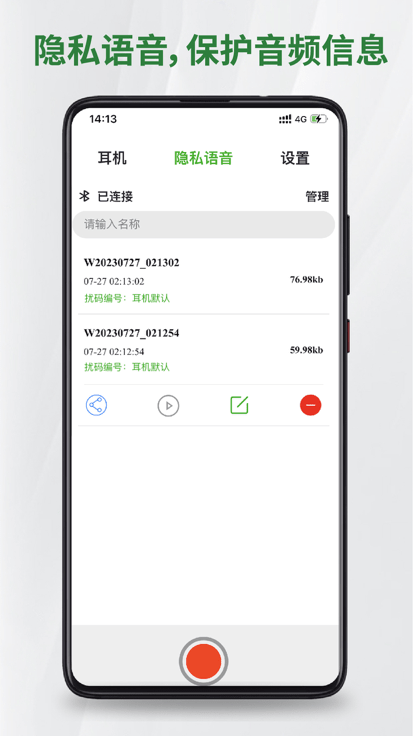 3. 隐私录音:使用耳机进行录音时,录音内容将受到加密保护,仅供用户及指定人员分享,有效防止录音外泄。