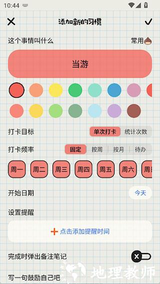 2、输入习惯的名称,设置提醒时间等参数,点击右上角保存