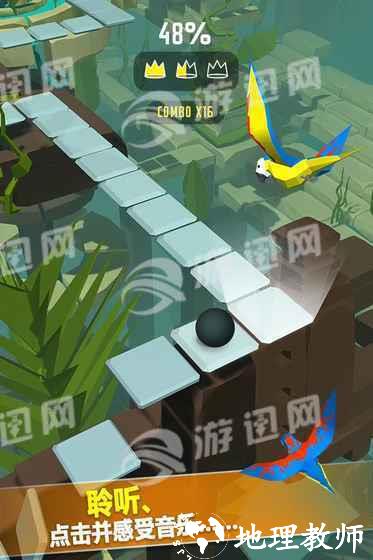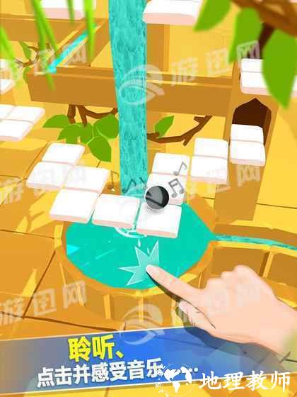 1. 根据音乐节奏点击屏幕上对应的按键,使小球准确通过轨道。