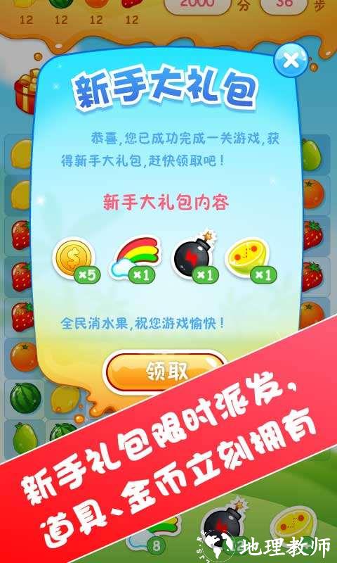 【全民消水果】这是一款简单好玩,新鲜时尚的水果消除游戏,玩上根本停不下来!2个以上相连的水果就可以点击消除,还能发现新水果,探索新旅程,同时消除多个水果还有惊喜噢!更多好玩等你来发现...更加入好玩的道具,让你轻松成为消除高手。超萌的水果,精美的画面...一起来一场鲜果之旅吧,新手礼包限量派送中
