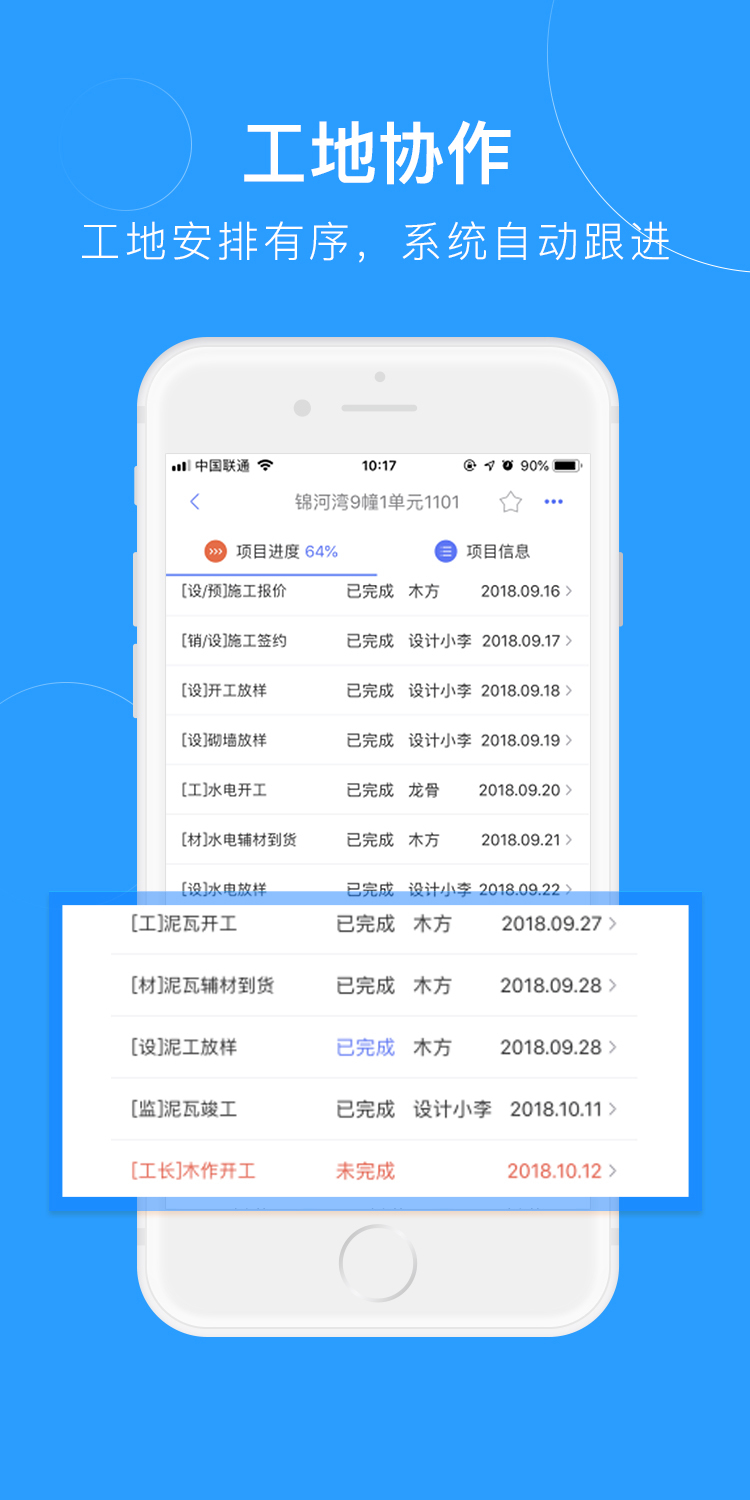 轻松管理项目,一键排期,项目自动跟进提醒,能有效解决施工延期、质量等问题;