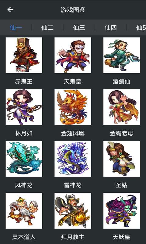 3、游戏图鉴:主要是所有不同类型的任务查看和介绍,共有仙一、仙二、仙三、仙四、仙五和装备;