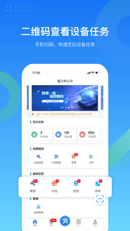设备报修,一键扫码报修,图文视频语音结合表述故障信息,维修过程实时监督,让维修管理透明化