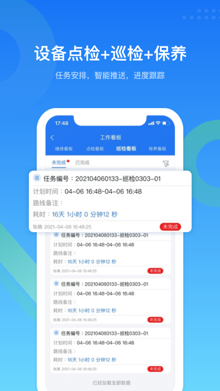 设备点巡检任务时间约束,过程拍照记录,发现故障可一键报修,真正将工作落实到位