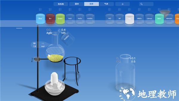 2、摆放好器皿后,点击 “水滴” 图标,即可选择各类化学原料;软件提供化合物、固体颗粒、液体和气体四大类原料,选中原料会显示其相关化学元素;