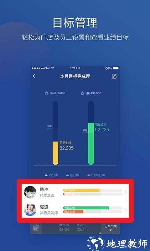 4、在目标管理界面设定员工或門市月度目标,随时查看完成进度与绩效排名。