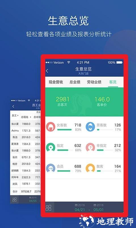 3、经营分析:统计客数与客单价数据;分析男女顾客比例;追踪指定技师占比;生成数十份专业报表;精准定位店铺运营问题。