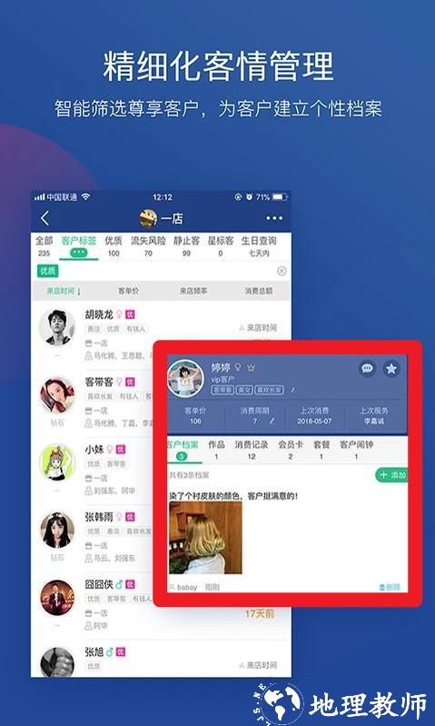1、售后关怀:烫染服务后三日回访;剪发服务后三十日提醒;生日当天自动发送祝福;支持沙龙自定义服务流程。
