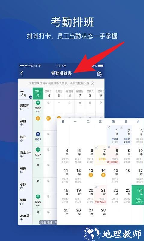 1、点击首页考勤排班进入日历界面,自定义员工班次并实时查看打卡与出勤情况。