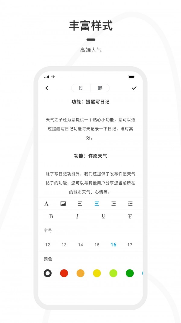 功能齐全的富文本日记,支持对齐、加粗、任意文本颜色、大写设置等,支持图文混排,每篇日记高达30张图片。
