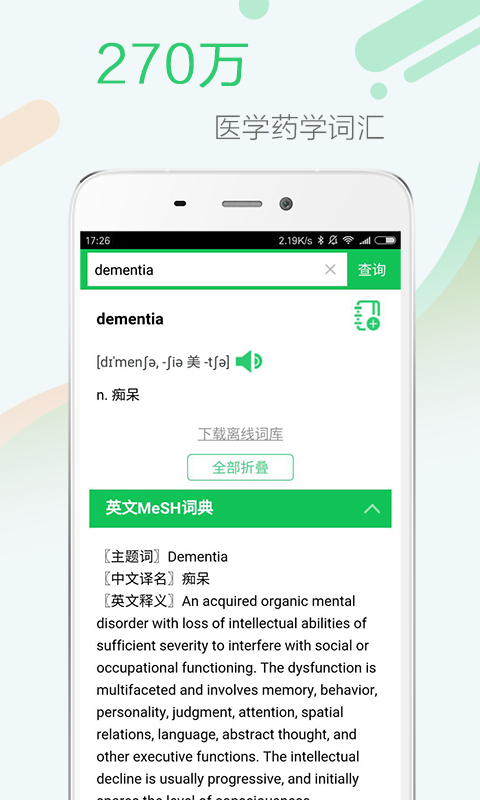 词汇查询:安卓版词典内置英汉简明医学词典,汉英简明医学词典,英汉通用词典和汉英通用词典共四本词典,总词汇量约300万条;可满足医学专业人员学术工作中的基本需求。