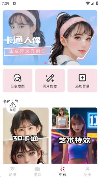 4、进入相机页面,支持换发型、照片修复、添加背景等操作,同时提供大量卡通人像模板,可直接应用打造特色作品。