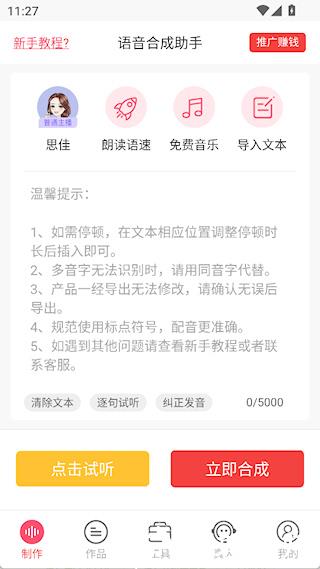 1、打开语音合成助手app,输入文本后点击立即合成,一键生成配音