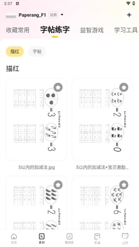 2、在素材界面下,我们可以体验到字帖练字、益智游戏。