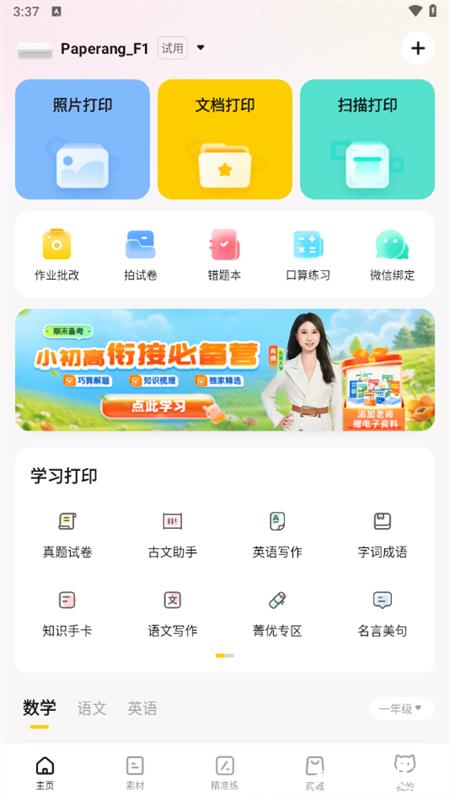 作业帮喵喵机是配套智能硬件设备的学习打印工具,适配错题整理与多场景打印需求,界面采用功能模块化布局,打印操作与素材选择流程简单,对接作业帮题库资源,拍照提取题目后自动匹配解析,内置海量图文素材与模板库。