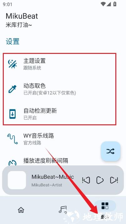 6、点击【更多】选项,可对软件进行基础功能设置,比如调整主题效果、音乐路线等。