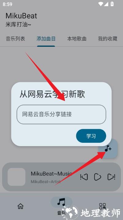 5、若想添加新曲目,点击页面右下角【+】按钮,将网易云音乐分享的链接复制粘贴进来,完成导入学习。