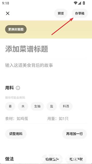 3、完善菜谱的相关内容,如封面、标题、用料等,可以点击【下一步】暂时保存;