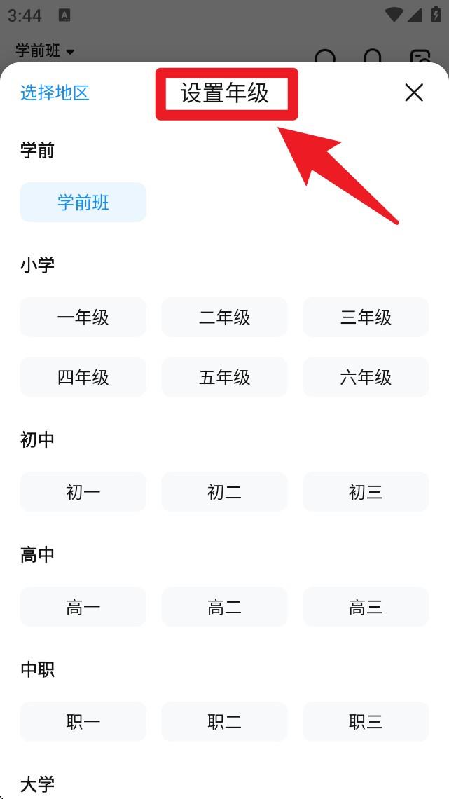 2.在弹出的年级设置页面中,点击设置年级标签页,并从小学到大学中选出你的所在年级。