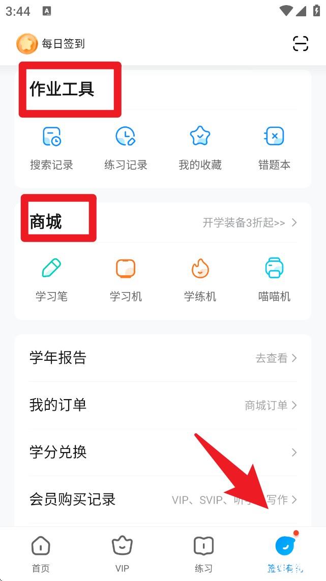 5.进入签到有礼页面,在此页面查看作业工具和商城板块内容,获取更多学习资源。