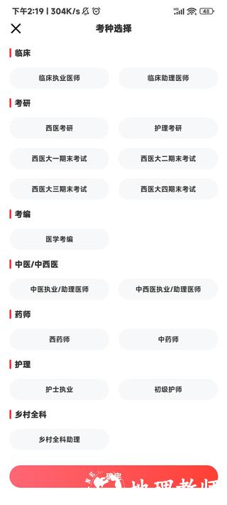 2、根据备考目标(如执业医师、助理医师、考研等)选择对应考试门类,确认后进入 APP 主界面。