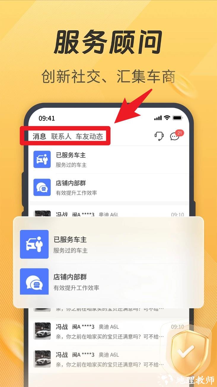 5. 前往服务顾问界面,可查看消息通知、联系车主及车友动态,方便与客户保持沟通,有助于提升服务体验和复购率。