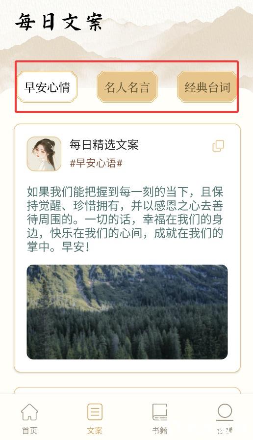 3、文案板块每日更新早安寄语、名人名言及经典台词等精选文字内容。