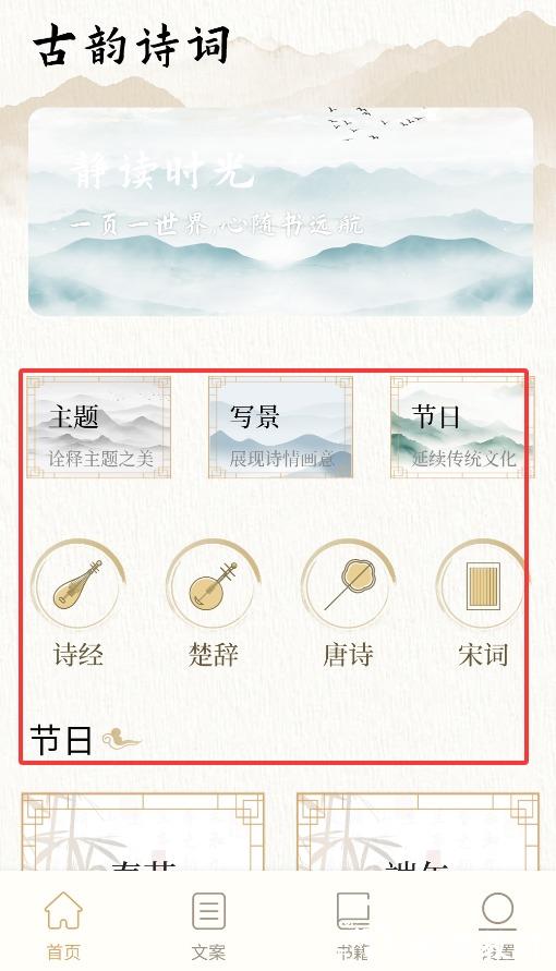 2、首页提供主题分类浏览功能,涵盖写景、节日及诗经楚辞等文学题材。