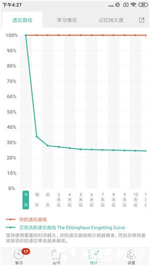 4、进入统计界面,查看自己的学习情况,通过记忆持久度、遗忘曲线的辅助分析,更好的规划单词记忆方法。