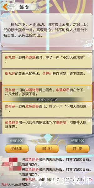 3、其他增加人气的方法。除了连胜,打赏和喝彩也可以增加人气,当然扔鸡蛋可以给别人减人气(强烈不推荐这种损人利己的行为,修仙修心,不要为了一点点小利就损害他人的利益)。一个号,每天可以打赏5次(免费不花钱的)、喝彩5次(每次500灵石)、扔鸡蛋5次(每次500灵石);1次打赏+2人气,1次扔鸡蛋-2人气,1次喝彩+1人气。
