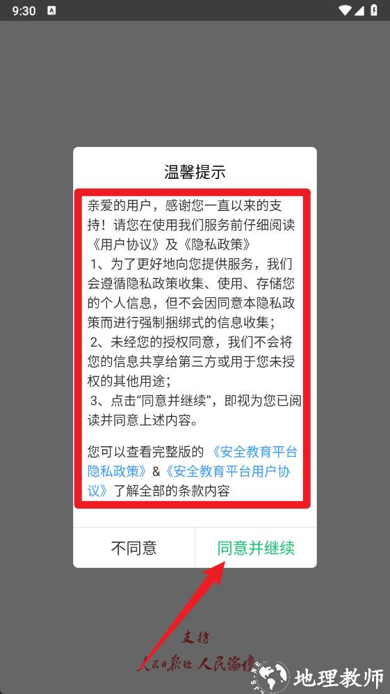 1、首次进入安全教育平台时,会弹出用户协议及隐私政策提示,需点击同意并继续按钮后才能正常使用。