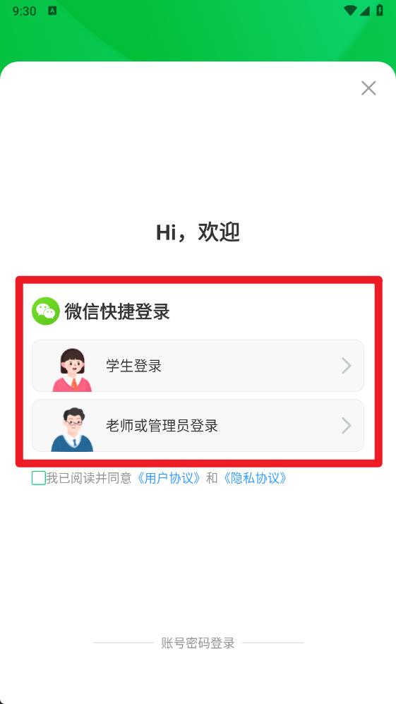 2、支持学生登录和教师或管理员登录,可选择微信快捷登录或账号密码登录,根据身份进入平台。