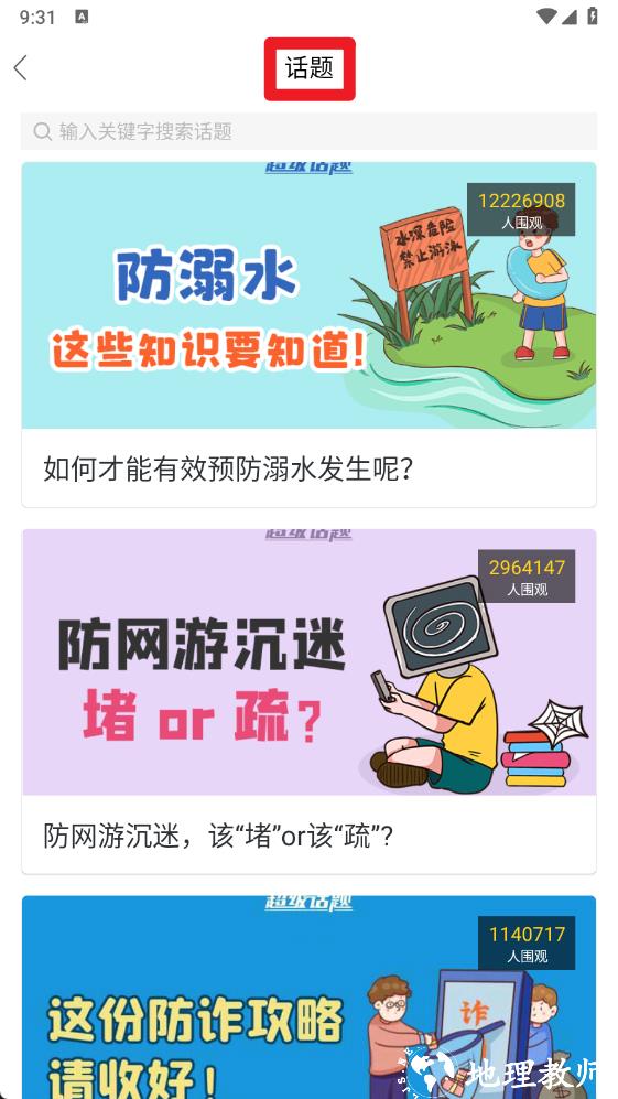 5、在话题栏目中,用户可以浏览各类安全教育主题,点击进入了解详细知识内容,并参与互动学习。