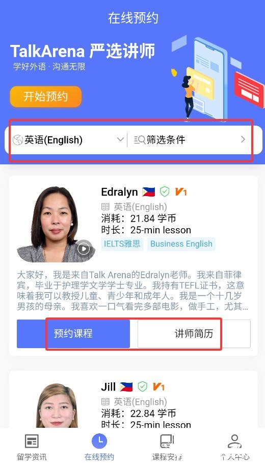 2、在线预约支持按条件筛选课程,可查看讲师资历与课程详情后预约。