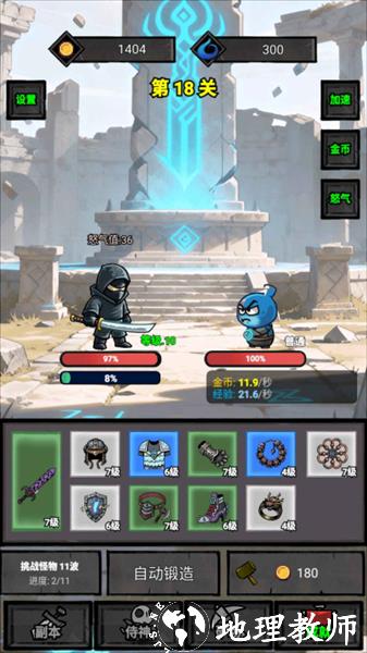 2.在战斗界面,角色会自动进行战斗,挑战关卡怪物。战斗过程中可获取金币、经验等资源,同时积累怒气值。界面底部可查看当前装备、关卡进度,还能通过 “副本”“侍神”“矿场”“成就” 等功能按钮,管理资源、培养角色。