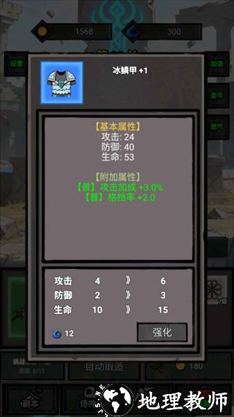 5.选择需要强化的装备,查看其基本属性和附加属性,消耗相应资源(如蓝色材料),点击 “强化” 按钮提升装备的攻击、防御、生命等属性,增强角色战力。
