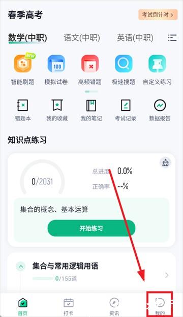1、打开已安装好的春季高考聚题库应用,进入首页后点击 “我的” 板块;