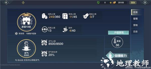 3、家园灵器远山台纳灵。日常获取灵气的方法。灵气转化速度和每次能获取的灵气上限均与家园等级有关。前期可以先把这个科技解锁,给的经验也是比较可观的。操作方法:靠近远山台——纳灵。