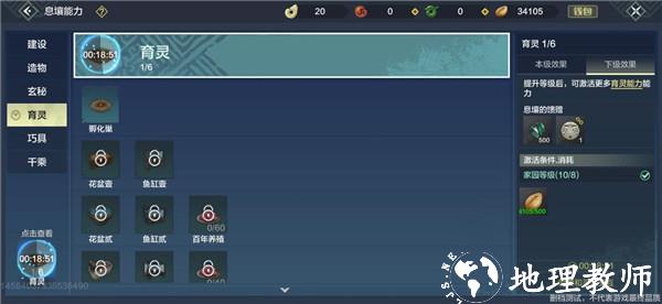 育灵主要是孵化元胎,培育花草,养殖鱼苗 的功能。除了孵化巢之外,其他可以等到游戏中期再解锁。