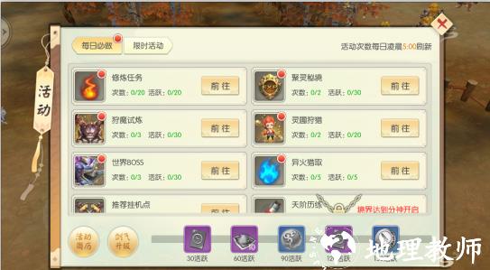 技巧2.日常任务:随着等级提升会解锁更多玩法、副本,通过点击“日常”按钮,即可快捷参与到各项日常活动中,获得大量金币、经验、道具、装备等奖励,组队刷怪还有经验加成,所以叫上你的小伙伴,来打怪升级吧!,其中每天2次的聚灵秘境经验非常丰富,是现版本最好的升级渠道没有之一,所以千万不要错过。能有经验加成的药水就不要吝啬,狠狠的砸上去吧。另外,20环的修炼任务也提供有大量的经验与金币奖励。