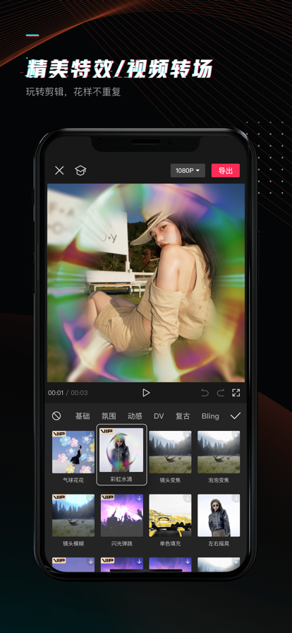 3. 素材丰富:内置海量的滤镜、贴纸、特效和背景音乐,满足不同场景的创作需求。